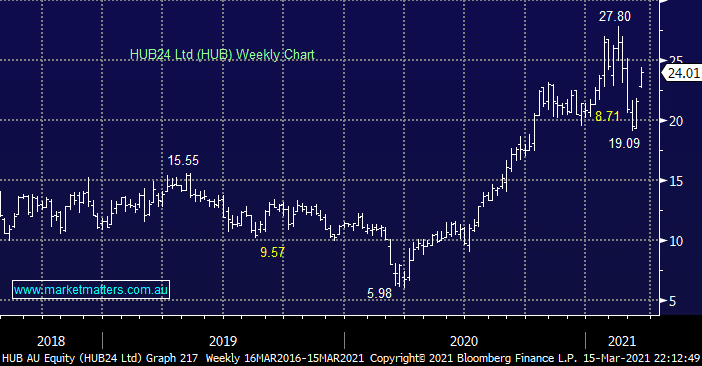 Yesterday we mentioned HUB’s entrance into the ASX200 in a weeks’ time, a “promotion” that was heralded with a 11.2% rally by the financial platform operator yesterday . We like this leading provider of integrated platforms, data and technology services but we are reticent buyers at present as MM is overall wearing our “sellers hat”. That said, HUB does look well positioned both operationally and technically to test $30 moving forward – perhaps one for some diversification across our portfolio when we ultimately increase cash levels.