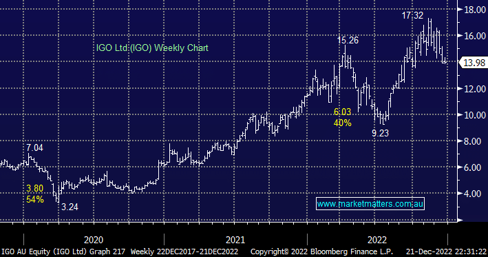 Nickel and lithium producer IGO has now corrected almost 20% from its November high but we’re still not tempted to increase our 3% position, short term we remain more a seller of strength than a buyer of weakness. While we are major fans of this business and its strategic direction moving forward the stocks already corrected 54% and 40% at points in the last few years, so why not again?