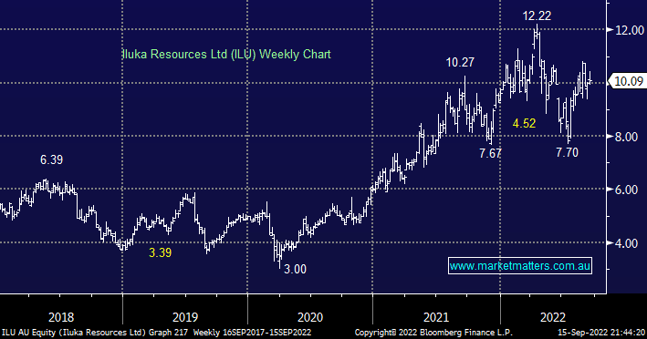 Minerals sands & rare earths newbie ILU has held above $10 even after paying a 25c fully franked dividend earlier in the month. Further consolidation around $10 wouldn’t surprise but after its strong half-year result in late August we feel a charge towards $12 is on the cards once the market overcomes its ongoing bond market jitters.