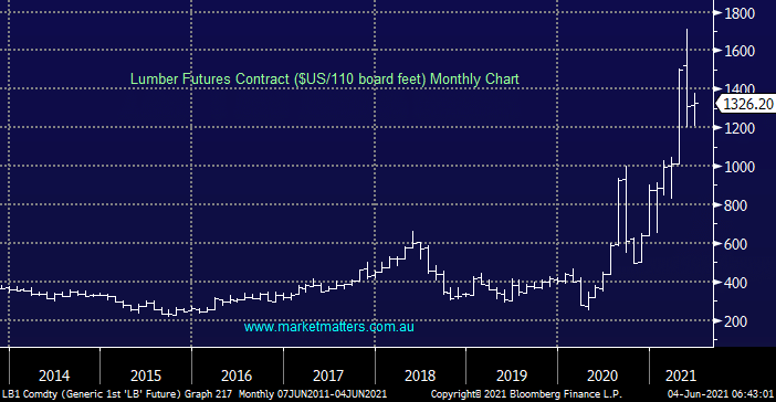 - Commodity prices have already bolted with the likes of lumber surging around +800% since the COVID outbreak but we should be mindful this is arguably largely built into today’s market prices.