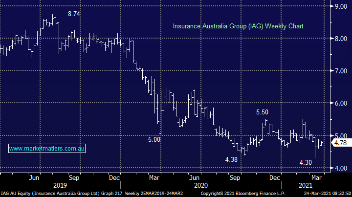 IAG trades on an Est P/E of 19x FY21, however this is a year of recovery. Looking our to FY22, this number drops materially as underlying profit is expected to rebound, pushing that number closer to 15x, which is very cheap for IAG from a historical context. It’s also expected to yield 5.4% while we wait for the earnings recover.