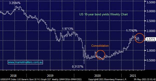 MM has been calling a few months consolidation by bond yields which continues to unfold nicely, this may have further to go but we feel it’s slowly running out of time and a breakout is looming. Our preferred scenario is the move will potentially fail, especially if it’s on the downside. We are especially keen buyers of dips in yield below 1.5% as the new trend on the upside is the most likely to throw up surprises.