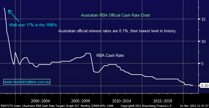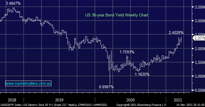 Last week we saw US 30-year bonds continue their push towards 2.5% but with the Fed meeting this Wednesday / Thursday MM wouldn’t be surprised to see Jerome Powel attempt to calm the excited bond market however its likely to be a tough ask with Joe Biden’s aggressive $US1.9 trillion stimulus being rolled out asap – we can see the 30-years rotating between 2 & 2.5% for the next few months.