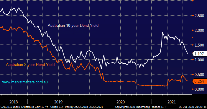 Australian short and longer dated bond yields continued to slide lower last week as the Delta strain dampened economic optimism with many small businesses doing it really tough as the Sydney lockdown is being touted to last into September. it’s hard to imagine a pickup in optimism short-term but again we must remember major lows are often formed when things look their worse plus importantly MM has been calling this fall away in bond yields for months with the intention of establishing a bullish yield view across our portfolios: