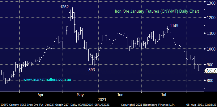 Similarly iron ore has been coming off the boil since early May with the bulk commodity currently ~32% below its 2021 high, our ideal retracement target is around 8% lower which may provide some excellent risk / reward opportunities into some major Australian names.