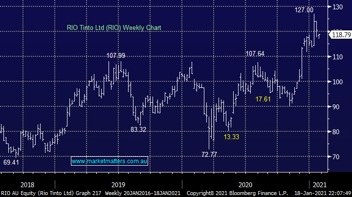 The likes of RIO Tinto (RIO) and Fortescue Group (FMG) have corrected ~8% in recent weeks even while iron ore has r emained firm, no great surprise considering their explosive rally since November. A further 5% pullback and we feel these stocks will look again very attractive with aggressive upgrades to earnings and dividends likely to flow through the market if the bulk commodity can maintain current levels i.e. the market is pricing in lower iron ore prices not current, or even higher levels.