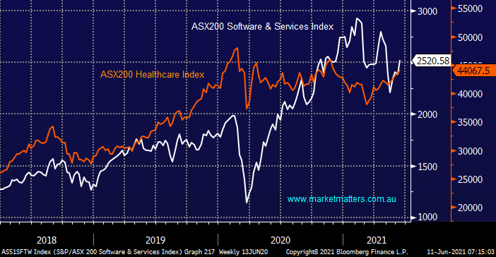 The majority of 2021 has seen a the fairly aggressive rotation out of the growth stocks into the old fashioned value end of town i.e. sell Healthcare & IT to buy Banks & Resources with the catalyst being soaring bond yields as the global economy recovered from the pandemic. However MM has been pointing out recently that we felt the elastic band had stretched too far and as bond yields drifted lower investors’ appetite for the growth sector would increase, this has been unfolding on cue of late, including last night.