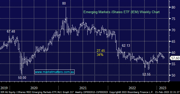 The emerging markets have bounced along with most indices from last October although a resurgence by the $US has weighed on performance over the last few weeks. This is a basket of stocks that run their own race and at this stage, we like the exposure as China’s reopening should help the Asian region in particular – we may consider exiting our IEM ETF position ~8-10% higher depending on how the China v central banks balancing act is playing out.