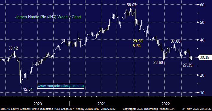 MM went long JHX in late October just before the building materials business downgraded its FY23 guidance by around 7%, another example of the vagaries of reporting season. However, the stock and sector appear to be slowly regaining their mojo after an annus horribilis and we still believe JHX has the right strategy to drive margin recovery through FY23. We have no doubt that the US construction industry is slowing down but we’re conscious that JHX was trading around $58 only 12 months ago i.e. there’s already plenty of bad news built into JHX’s share price.