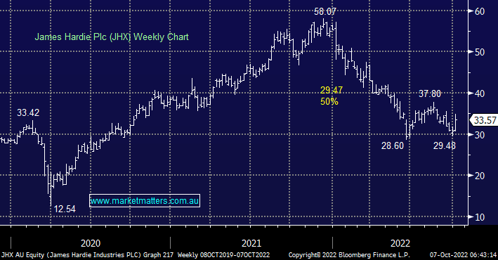 JHX has resided in MM’s Hitlist for a while, the business is highly leveraged to the US housing market which has struggled as interest rates have exploded on the upside but after halving in less than 12 months we believe the stock is now providing excellent value as plenty of bad news is already factored into the share price. – Most importantly August’s earnings report showed nothing which overly concerned us.