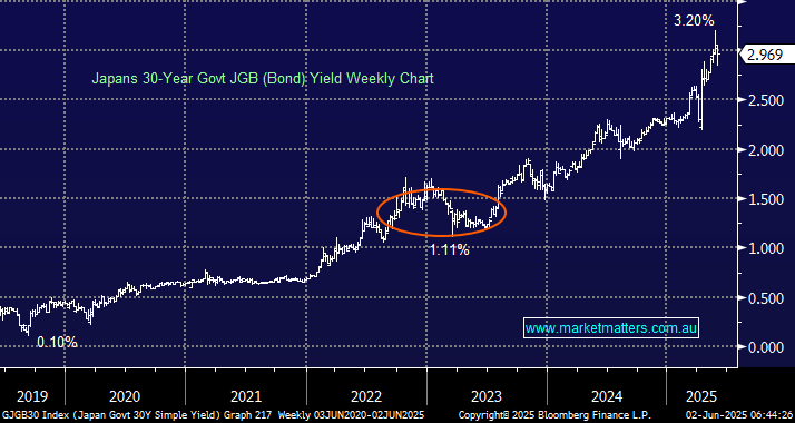• We can see the JGBs consolidating, similar to what they did in 2022/3, but we’re conscious that the trend remains bearish for JGBs (yields higher).