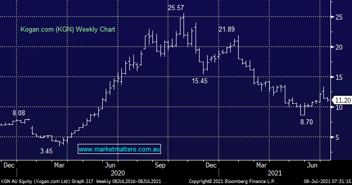 On line retailer KGN was not surprisingly the sectors top performer yesterday as NSW’s lockdown was extended for at least 1-week. The ‘bump’ in sales will help their much publicised inventory issues which have led to an engrained downtrend through 2021. The stock is showing signs of life and we added to our position in the Emerging Companies Portfolio ~$10.70