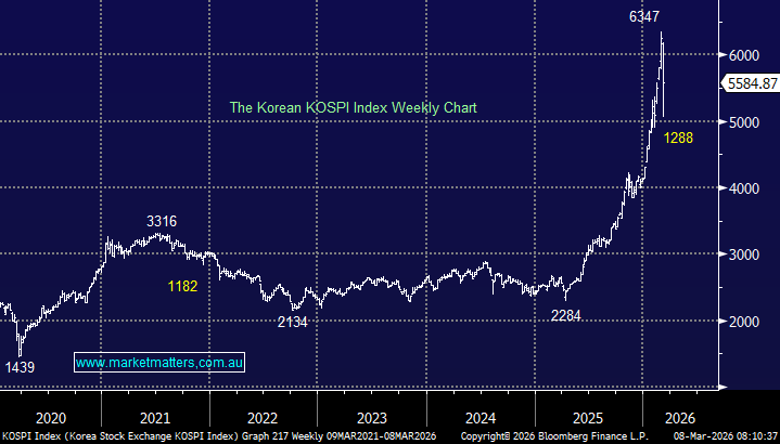 • Its not for the fainthearted but if we see a panic spike under the psychological 5000 area in the coming weeks we believe it will provide an excellent risk/reward opportunity to buy into the semiconductor industry – the US-traded EWY ETF is one way to gain exposure to the KOSPI.