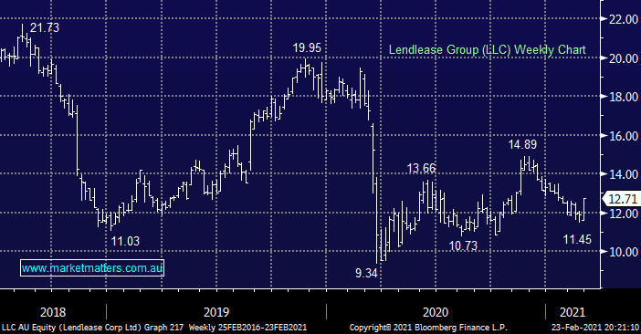 One recent characteristic that’s caught my attention through the current reporting season is the “delayed response” to company’s profit reports / updates. On Monday Lend Lease (LLC) slipped a few cents lower after reporting core operating EBITDA of $405m however on Tuesday after digesting the result overnight LLC soared more than +8% to its highest close in over a month, obviously analysts decided to embrace the companies shift towards core urbanisation and investment platforms. After recently correcting 23% I can see LLC building on yesterday’s gains – fingers crossed that’s not tempting fate!