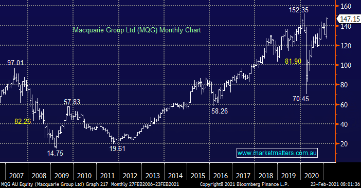 Its not that often that MM talks about buying a stock that’s making fresh multi-month highs but after its latest report MQG fits that profile. We are bullish both the sector and the stock and feel MQG will be trading at least 10-15% higher in 2021 plus its due to deliver nice dividends in May & November.