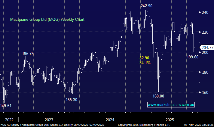 MQG –5.74%: The diversified financial group’s first-half net profit of $1.66bn (+2.7% YoY) missed consensus estimates by ~11%. The miss was largely due to weaker commodities group (CGM) income and impairments in green assets, slightly offset by strength in Macquarie Asset Management (MAM).