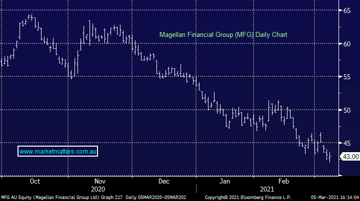 The fund manager today announced it had seen $691m in inflows for February, with positive retail flow offsetting net redemptions from institutional investors. Total FUM was only ~$200m better off though as investment movements weighed. Still, Magellan manage more than $100b with around 75% in global equity investments. The stock has been under pressure lately – a weak tech sector/growth names hurt at Magellan, though we feel this is overdone.