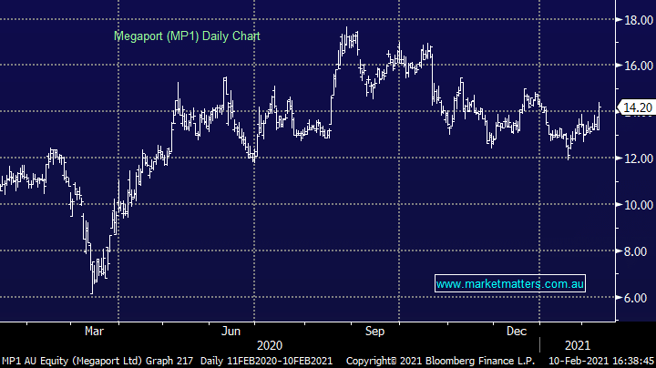 Megaport (MP1) +7.33%:  A good 1H update from MP1 today with all key growth metrics heading in the right direction. Revenue was up 39% yoy with monthly reoccurring revenue up by 11% on the half. Customer numbers +11% and ports which is key +16%. EBITDA was a touch light however that’s not the main game for MP1. They outlined their ‘pathway to profitability’ saying they’re on track to achieve EBITDA breakeven on an exit run rate basis in FY21, or in other words, if current momentum is maintained.