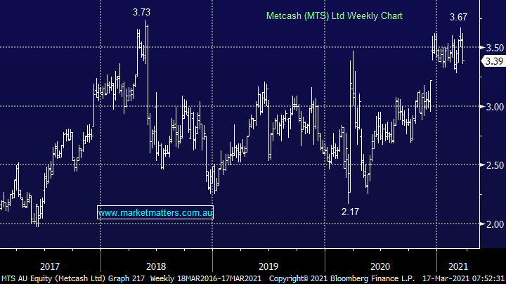 Portfolio holding Metcash (MTS) held an investor day yesterday and also delivered a trading update and moved their dividend payout guidance up from 60% to 70%. MTS trade on an Est P/E of 13x and they are forecast to yield 4.57% fully franked over the coming 12 months. Like the other Supermarkets / Hardware operators, MTS have been COVID beneficiaries and the sales momentum has continued in the first 4 months of the 2H. I thought yesterdays update was a strong and set our a credible strategy for MTS over the coming 5 years. The stock was initially higher on the news however was sold off throughout the session.