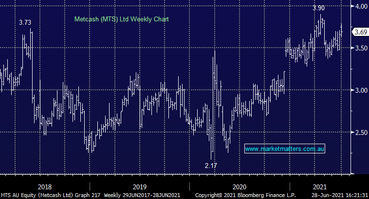 MTS +0.82%: announced FY21 results today for an April year end. The numbers were broadly a miss both at top and bottom line despite 10% revenue growth, and 27% growth in NPAT line on FY20. Consensus was around 6% higher at the bottom line, the stock still managed to trade higher today given FY22 has started strongly. The first 8 weeks are tracking better than feared with the market pricing in a significant slowdown in sales as COVID impacts subside. Liquor and hardware are both showing better than 25% growth on FY20, before COVID helped boost sales. They also announced a $175m off-market buy back to take place in August to utilise some of the franking credit balance.
