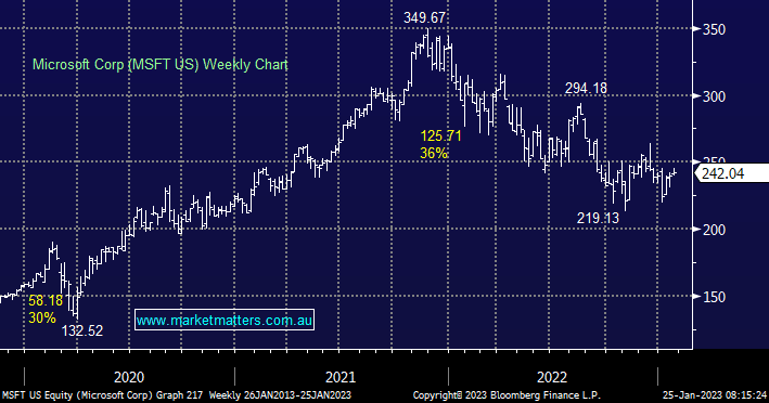 - We are initially targeting a test of $US275 for MSFT encouraged by this morning’s solid result.