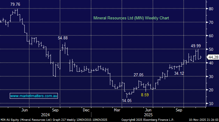 Monday was case of two out of three’s not bad for MIN with its lithium and mining services divisions delivering strong tailwinds while iron ore has weighed slightly over the last week. However, the stock still advanced over +4% on Monday with fresh 2025 highs looking likely if our bullish outlook for Li proves on point – MIN still has an almost 7% short position, but notably it’s more than halved since June.