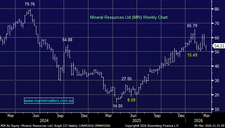 MIN follows the iron ore and lithium price closely and at this stage of the cycle we can see the likes of fellow lithium names PLS Group (PLS) falling ~10% hence we are in no hurry to buy back into MIN. The stock rallied close to five fold over the last twelve months and the current pullback, at this stage, is nothing more sinister than consolidation following the stellar advance. A “washout” style move, sub $50, would provide some excellent risk/reward in our opinion.