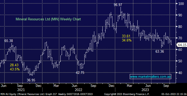 We felt MIN reported well in August, but after popping ~18% higher, the stock has been weighed down by a deteriorating broad market, including further weakness across the lithium sector, which has overshadowed relative strength across the iron ore stocks, i.e. MIN’s revenue in FY23 comprised of the eclectic mix of 44.9% iron ore, 39.6% lithium and 15.3% mining services.