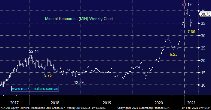 This iron ore / lithium miner delivered an excellent half-year result earlier this month which as helped propel the stock back towards its 2021 highs. We like this stock for a break towards $42 but in-line with our volatile prognosis for this year I believe there’s a strong possibility MM will have an opportunity to enter in the low $30 region I.e. don’t chase current strength.