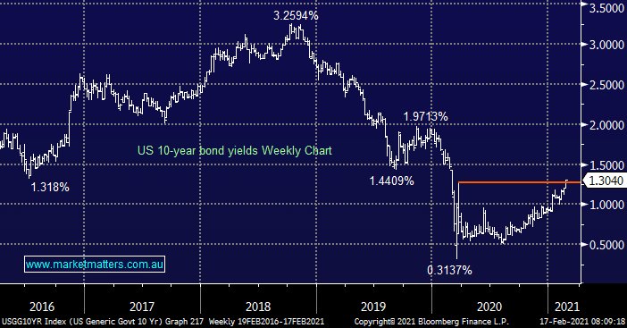 The bounce in US 10-year bond yields has continued this week but in-line with our “time for a rest” view another period of consolidation wouldn’t surprise however we remain bullish and cognisant that surprises are still likely to be on the upside. This rally in longer dated bond yields theoretically favours the Resources & Banks over the IT stocks.