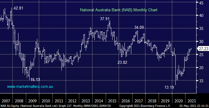 NAB is following in the footsteps of WBC with a just a touch less momentum, our ideal entry level is back towards $25 which might be possible post its dividend which is also due on the 13th of this month.