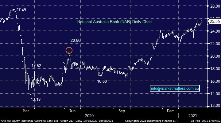 National Bank (NAB) +1.07%: 1Q21 trading update today so not a lot of information in it, however what we did get was decent. For the quarter, cash profit was $1.65bn which was ahead of market expectations and that was driven by a lower credit impairment charge. Looking at the top line however, revenue was down -3% due to lower Markets & Treasury income however that was cycling off a strong period, the real number was around 1% growth which compares to CBA which is growing the top line at 4%, although NAB are doing a better job on costs. NIM was down slightly, but not by much and they reconfirmed FY guidance for underlying expense growth of 0-2%. There were very low credit impairments (just $15m) while tier 1 capital was 11.7% i.e. strong. That impairment charge is the lowest ever! All in all, a decent result and we remain comfortable with our holdings.