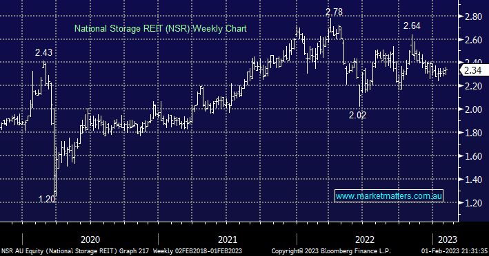 Self-storage business NSR is forecast to yield 4.9% unfranked over the next 12 months, a supportive reason to like NSR but certainly not a standalone reason to buy. One positive for the business is its ability to re-price rents in today’s inflationary environment due to shorter-duration contracts although like many companies it’s still likely to see a dip in earnings if we do experience a deep recession, we believe the stock’s recent ~10% correction is starting to fully price in a local cash rate ~4% but most brokers don’t agree with us i.e. 1 strong sell, 3 sells, 3 neutral and only 2 buys with a consensus price target of $2.33 which can all be viewed here.