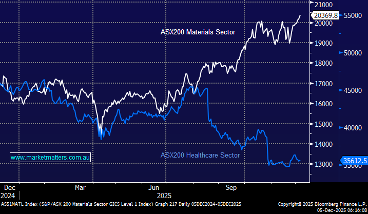 A month ago, we looked at the resources through the eye of some local ETFs and with the market largely unfolding as we expected, members have been asking us “what now” after the sector pushes higher. So far in 2025, the materials sector has surged +26% while tech -15% and healthcare -21% have struggled. However, we always must be cognisant that good things don’t last forever, and performance elastic bands often snap back as opposed to easing back to a fresh level of equilibrium. Just imagine holding a portfolio heavily weighted to tech and healthcare through 2025, it will have been an extremely tough year.