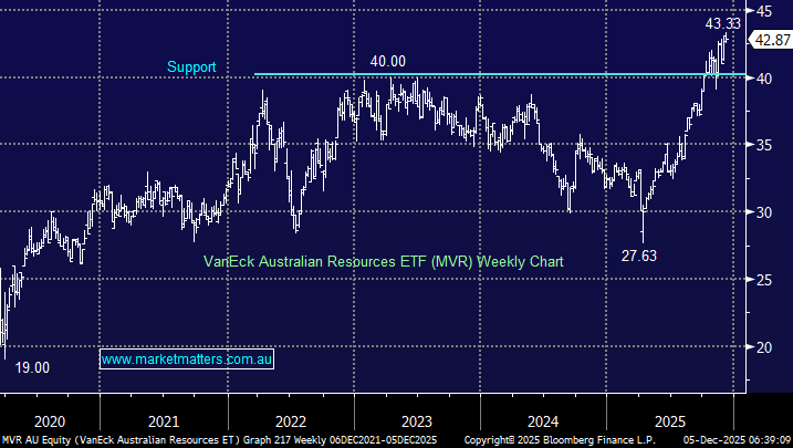 The risk/reward is unappealing ~$43 and we would be more inclined to adopt a “wait and see” approach as the ETF trades around fresh highs – at this stage of the cycle MM prefers a more stock and sector specific approach as opposed to using a more scatter gun like strategy which the MVR ETF provides.