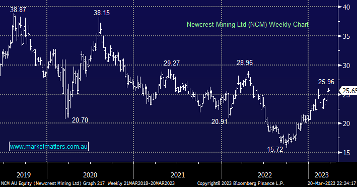 - We like NCM for an initial test of $29 and potentially much higher, the recent bid from US giant Newmont (NEM US) is helping the performance of Australia’s major gold play.