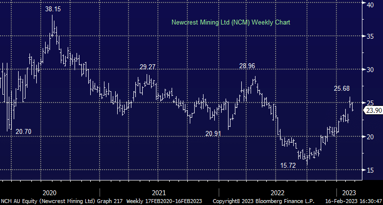 They also rejected the bid from Newmont (NEM US) on valuation grounds, but are prepared to give them a look under the hood to try and entice a higher bid. Based off the latest Newmont share price and FX, the 0.38 scrip offer is down -7% to A$25.45/sh NCM vs A$27.45/sh week end 5-Feb close. Barrick Gold (ABX) have ruled out a bid for NCM, CEO Mark Bristow stating overnight “We’re not going down that road at all” and “Getting big for the sake of getting big doesn’t make much sense”. While there is more to play out here, NCM is also delivering operationally which can only be positive.