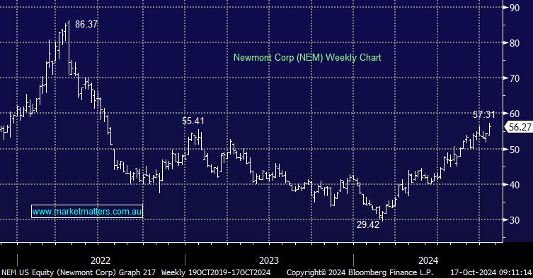 - We like NEM but wouldn’t be surprised to see it consolidate in the $US55-60 region before pushing higher.