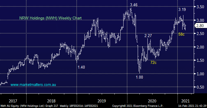 Another stock that reversed higher yesterday was NRW Holdings (NWH) which finally closed up +4.5%, we’ve discussed this engineering business a bit earlier after missing a healthy profit opportunity above $3 but after correcting almost 20% we are now comfortable with the risk / reward again at current levels. Some pundits suggested the stock rallied on the back of the successful acquisition of Primero, but we felt this was inevitable although certainly it’s a great strategic $100m deal for NWH.