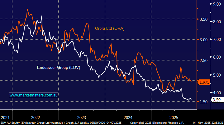 With ORA’s recent result beating expectations and importantly with Saverglass driving the result, weakness on concerns around the huge ~$2.2bn acquisition is starting to look off point. Although ORA has bounced since March, it’s still trading on the cheap side compared to the last few years, when we believe, if anything, it should now be on the other side of the ledger, supported by its 5% yield and the M&A potential. However, we shouldn’t get carried away, revenue is only set to rise 5% to $2.2bn in FY26, with its Australasian glass business volumes having been under pressure for some time due to declining beer and commercial wine markets domestically.