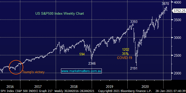 US stocks had a tough session overnight with every sector closing lower although Energy felt begrudgingly so. The chart below illustrates stocks are still only a few good days away from their all-time high hence we are definitely not panicking re equities, but we have been pointing out they’ve been overdue a pullback, it feels like it might just have started.