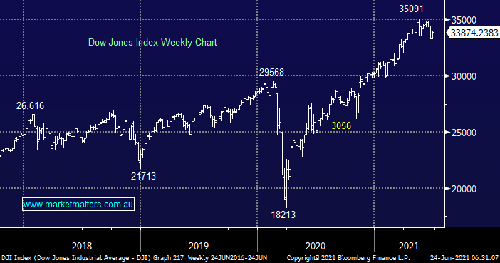 Again no change to US stocks which have basically gone nowhere on the index level for around 2-months, similar to the ASX sector rotation continues to dominate proceedings, the Dow Jones still remains within 3% of its all-time high as it bounces strongly from sharp weakness last week. Short-term we are 50-50 as the market continues to grind higher, “selling strength and buying weakness” still feels on point with this particular and other indices.