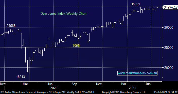 Overnight was a firm session for US indices ahead of their reporting season which saw strength in the Resources & Banking Sectors, similar to our own yesterday. The Dow is now trading within 0.3% of its all-time high, a bridge that looks likely to be crossed in the coming week however we remain neutral around current levels which is no big call considering the index hasn’t moved anywhere in 2-months plus upside momentum since its current leg higher started last September is slowly but surely deteriorating.