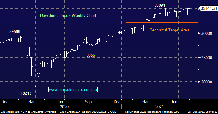 Overnight saw another solid session for US stocks with the Dow finally poking its head into uncharted territory, it’s taken a while for the old stalwart to follow the likes of the tech stocks but it got there in the end. Our medium-term target of ~36,000 is the next psychological milestone and its now less than 2.5% away.