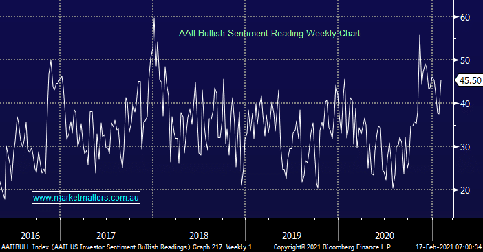 US markets were mixed overnight with most major indices closing basically unchanged. The small cap Russell 2000 has been the clear outperformer but even this runaway train is starting to “feel” a little stretched and in need of a rest.