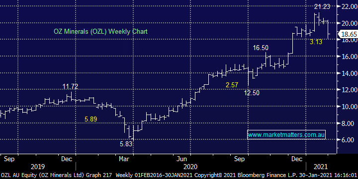 MM has been a big fan of OZL since we felt a reflation theme was the way to play equities through 2020 / 2021. We simply believe it’s the best quality stock in the copper space and after its recent 14% pullback the risk / reward looks good.