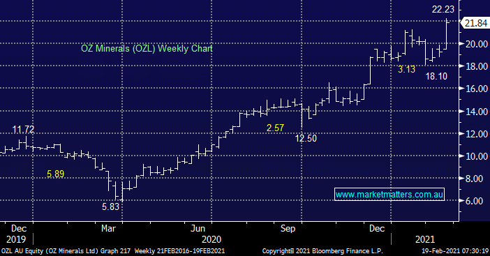 OZ Minerals (OZL) is our most recent purchase in the space and we’re already showing a profit of 14%, we see no reason to sell OZL at this stage but since we switched from Sourth32 (S32) the later has only rallied 4% illustrating the power of correct switching within a sector in today’s active market. Our other 2 holdings in the sector BHP Group (BHP) and Alumina (AWC) have performed very differently in 2021 with BHP up +14% while AWC is disappointingly down 5% throwing up a couple of obvious questions.