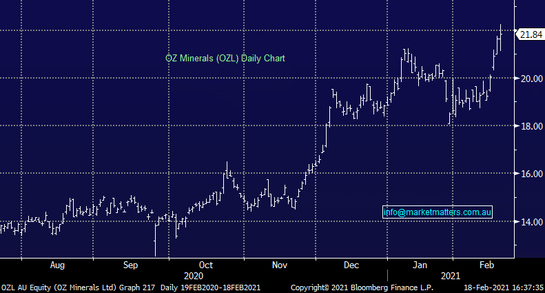 Oz Minerals (OZL) +0.97%: a full year result for OZL, caught a commodity tailwind into the end of the year across copper & gold. NPAT up ~50% to $213m was in line with expectations, net cash of $32m and operations all running smoothly. Carrapateena production ramp up has come in well ahead of schedule and focus now turns to the expansion project there. Guidance – costs and production – for the full year was unchanged from comments at the 4th qtr update. We bought last week enjoying both the commodity tailwind and the growth options OZL has access to.