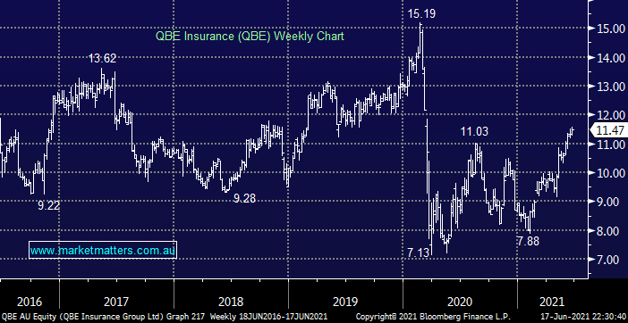 Serial underperformer QBE has finally started advancing solidly and in hindsight I wish I had given more weight to our technical analysis as opposed to fundamental one which still said steer away. However after surging strongly since late April when amongst other positive statements at its AGM the board announced a likely return to dividends this year the risk / reward is far less appealing and we would need to see at least a 5% pullback to reignite our interest.