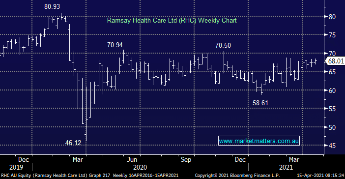 Private hospital operator RHC has been trading sideways for almost a year and we feel as the COVID backdrop improves this quality business is positioned strongly. Our 4% holding is not huge and we may look to increase as we tweak across other areas.